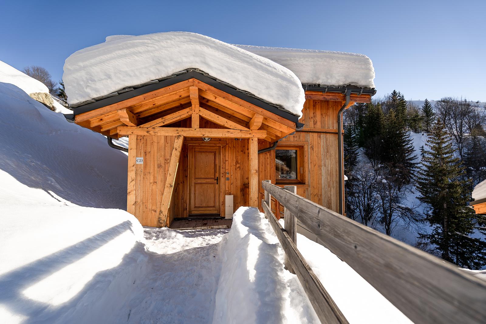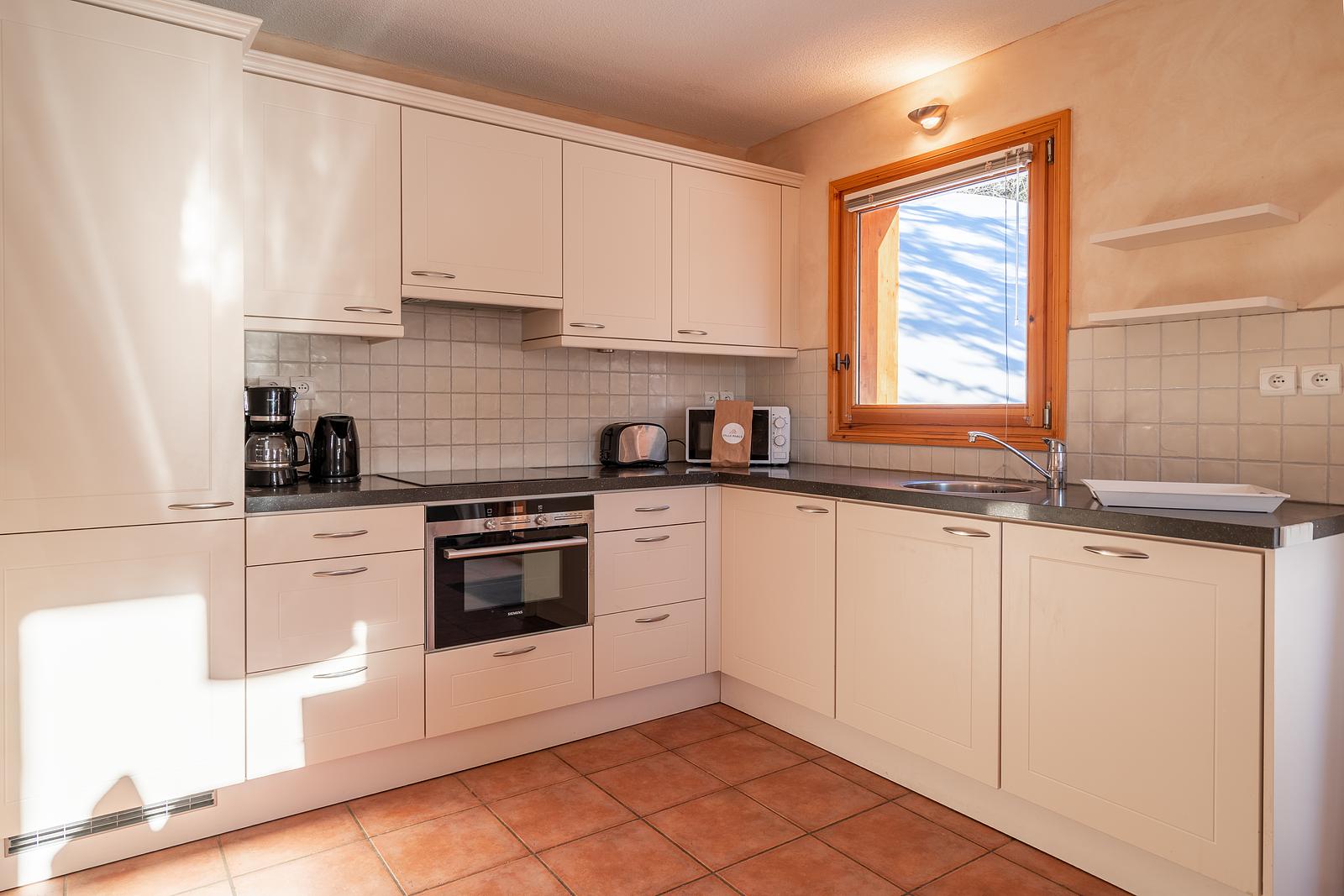 Die luxuriös eingerichteten, freistehenden Chalets für 12 Personen verfügen über 5 Schlafzimmer (eines davon ein Zwischengeschoss mit Etagenbett) und drei Badezimmer, eines oder zwei davon mit Badewanne, das/die andere(n) mit Dusche. Zusätzlich befinden sich in den Chalets drei Toiletten. Die Schlafzimmer der Chalets haben Boxspringbetten und ein Schlafzimmer (Zwischengeschoss) ist mit einem Etagenbett ausgestattet. Die luxuriöse Küche mit Einbaugeräten bietet allen Komfort, darunter einen Backofen, Mikrowelle, einen Geschirrspüler, einen Kühlschrank mit Tiefkühlfach sowie ein Kochfeld mit vier Platten. Das Kücheninventar ist mehr als ausreichend für 12 Personen.  Im geräumigen Wohnzimmer können Sie den Kamin und den Blick auf die Alpen genießen. Selbstverständlich ist auch ein Fernseher vorhanden, mit verschiedenen über Satellit verfügbaren Programmen. Die Chalets haben wunderschöne, große, nach Süden ausgerichtete Terrassen und/oder Balkone. Zusätzlich steht Ihnen für die sichere Unterbringung Ihrer Skis ein abschließbarer Skispind zur Verfügung.